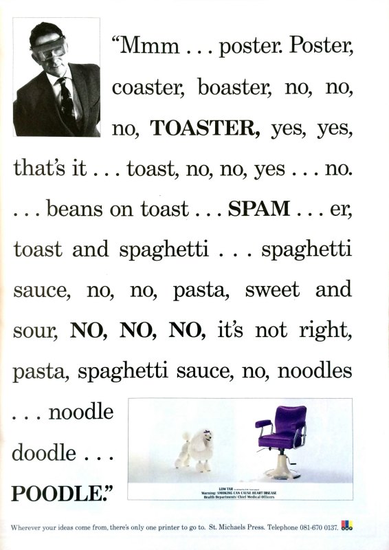 One day, when I was working with Nigel Roberts, Paul Arden walked into the office and asked us would we mind producing a brochure for St Michaels Press, who printed the Silk Cut posters for Saatchis. You didn’t refuse Paul anything so we said ‘of course’. About an hour later we had written this ad, which Paul loved. The following Thursday the ad appeared in Campaign, giving St. Michaels press a bigger more relevant audience than any brochure could have.