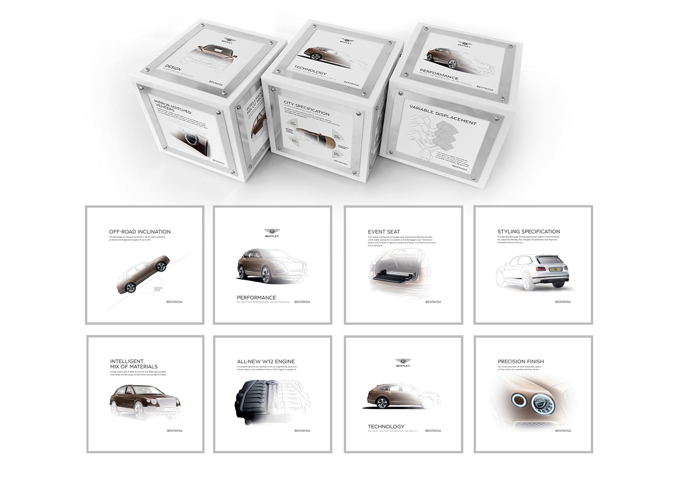 A series of point of sale pieces to explain the specifications of the new Bentley Bentayga.